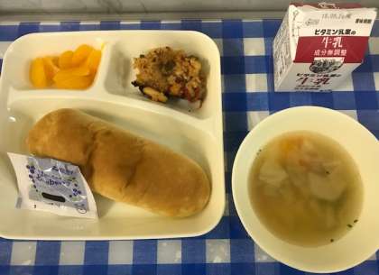 今日の給食は、パエリア、ウインナーと野菜のスープ、みかん(缶詰)、コッペパン、ブルーベリージャム、牛乳です。パエリアは、スペイン料理で、給食には2年に1度登場します。思った以上に好評で、各クラスにおかわりの列が出来ていました。4年生から、次に給食で食べる時はもう6年生になっているという事実に、「1年に3回ぐらいは出してほしいです。」という要望がありました。