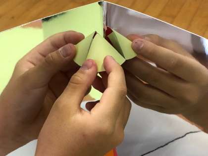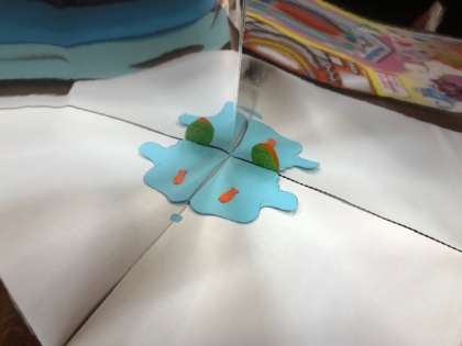 5年図工では、鏡にうつすと鏡の向こうにも世界をつくることができる性質を使って活動に取り組んでいます。2面の世界では鏡にうつすと半円を円として表現できたり、3面の世界では、円錐の一部をつくるだけで円錐になったりすることに気付くと、さらなる発想がどんどん生まれていきました。どんな鏡の世界が完成するのか楽しみです。
