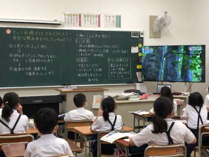 4年社会では、さまざまな自分たちの生活に身近な事柄について学びます。今は、私たちの生活に欠かせない水について考えています。今年は、なかなか社会見学に行くことができない日々が続いていますが、映像資料などを活用し、学びを深めていっています。