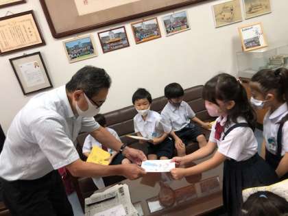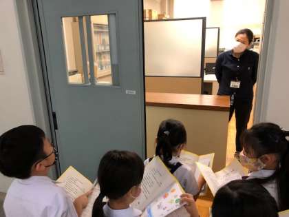 先日の「よろしくね集会」で2年生から教えてもらった学校を、今日は、1年が実際に探検しました。まず初めに、手作りの名刺を渡しました。自分のことを知ってもらった後には、「職員室では、どんなお仕事をしているのですか?」「給食室では、どんな風に給食をつくっているのですか?」など、直接インタビューし、さらに学校のことを詳しく知ることができました。