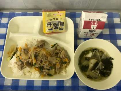 今日の給食は、豚丼、すまし汁、いり黒豆、牛乳です。今日は、1年生の学校探検で給食室にも数チームが来ました。手作りのかわいらしい名刺を自己紹介の時に渡してくれました。開平小学校は、約320人分の給食をたった2人の給食調理員さんが作っていることや、お風呂のように大きな釜を使っていることなど、とても驚いていました。給食について詳しくなって、毎日味わって食べてくれたらと思います。