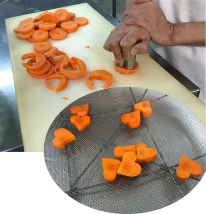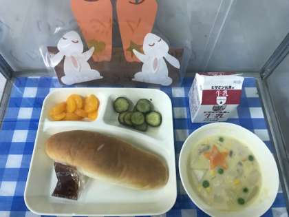 今日の給食は、コーンクリームシチュー、きゅうりのバジル風味サラダ、みかん(缶詰)、コッペパン、いちごジャム、牛乳です。コーンクリームシチューのルウは、小麦粉とバター、綿実油を使って手作りしています。今日は、ラッキーにんじんも入っていました。にんじんを輪切りにし、クッキー用の型を使って一つずつくり抜いています。子ども達はどのメニューもとてもよく食べていました。