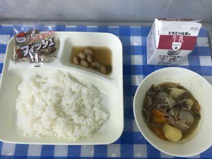 今日の給食は、肉じゃが、とら豆の煮もの、アーモンドフィッシュ、ご飯、牛乳です。とら豆は、給食で登場する10種類の豆のうちの一つです。とらのような模様があることからこの名前がつきました。とら豆を熱湯に30分間以上ひたし、その後、釜で1時間以上煮て作ります。ほくほくと柔らかく、とてもおいしい豆です。