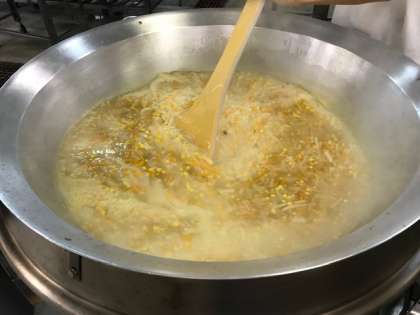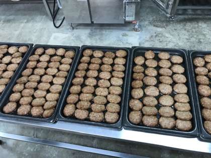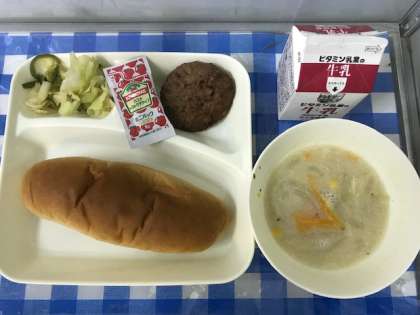 今日の給食は、焼きハンバーグ、豆乳スープ、キャベツとピーマンのソテー、黒糖パン、牛乳です。ハンバーグは、スチームコンベクションオーブンで焼いています。ケチャップをかけて食べます。焼きハンバーグや野菜のソテーをパンにはさんで、バーガー風に食べていた人もいました。「今日もどれもおいしかった!!」と大好評でした。