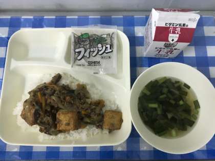 今日の給食は、マーボーあつあげ丼、中華スープ、ミニフィッシュ、牛乳です。今日で8月の給食が終わりました。本校の児童に8月の給食で特においしかったメニューを聞きました。「今日の丼!」「オイスターソース焼きそば」とメイン料理をいう児童がいる一方、「今日の中華スープ」「金曜日のオクラの甘酢あえ」、「きゅうりのピクルスとかキャベツとピーマンのソテーも最高やった!!」など、野菜料理がおいしかったという児童がたくさんいました。野菜は病気の予防に欠かせない食べ物です。これからもおいしくしっかり食べてほしいです。