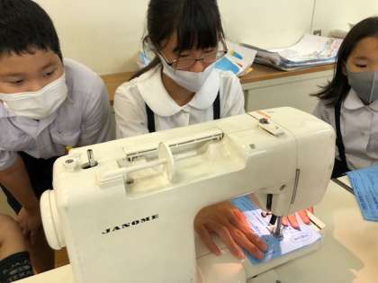 5年家庭科では、さまざまな裁縫に取り組みます。今日は、ミシン縫いに挑戦です。糸のかけ方、ボビンの入れ方など確認しながら進めていきました。