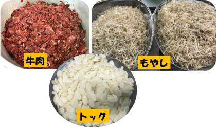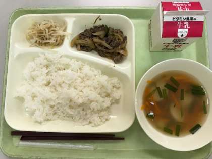 今日の給食は、プルコギ、トック、もやしの甘酢あえ、ご飯、牛乳です。プルコギは、韓国・朝鮮料理の焼き肉のことです。トックは、うるち米から作られたおもちが入ったスープです。もやしの甘酢あえは、酢がきいてさっぱりとしているので、食欲がわき、食べやすいです。本校の約320人分の給食を作るために必要な食材はとても多く、今日の給食の牛肉やトック、もやしなどもたくさん使用しています。大きなたらいやザルに入れて準備しています。