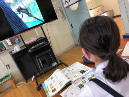 3年理科では、こん虫の体のつくりについて学習しています。今日は、こん虫が捕食している動画をみて、どのような体をしているのか考えていきました。なかなか目にすることのないシーンに子どもたちはとても驚いたようです。