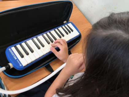 2年音楽では、拍にのってさまざまな楽器で演奏します。今日は、鍵盤ハーモニカで拍にのって旋律を演奏するコツを考えました。「のばしている音と短い音があるから、拍をしっかりと意識しないとバラバラになるな」「休みが短くならないようにしよう」と一人一人しっかり考えながら演奏することができました。コツをつかむと、楽譜を覚えて自信をもって演奏することもできました。