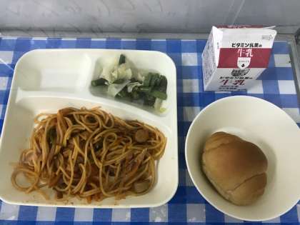 今日の給食は、イタリアンスパゲッティ、グリーンアスパラガスとキャベツのサラダ、黒糖パン(小)、牛乳です。いつも給食をもりもり食べている4年生から、「今日の給食おいしかったから5分で食べ終わりました。」、「僕の胃はまだ全然いっぱいになっていません。まだまだ食べたいです。」など、うれしい言葉を給食室にむけて言ってくれました。グリーンアスパラガスは苦手な人もいました。でも一口ずつがんばろうとしていました。
