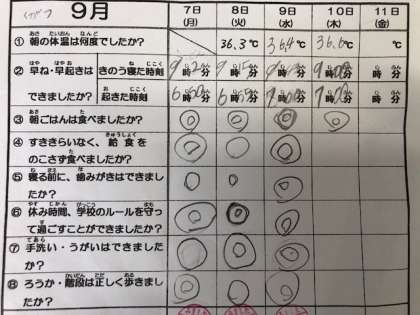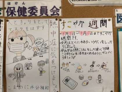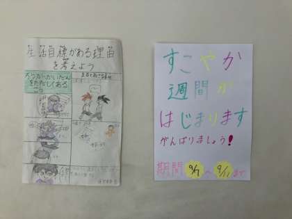 今週は、すこやか週間です。「げんきアップチェックカード」をつかって、自分の行動・生活の様子をふりかえっています。週末には、1週間をふりかえります。1週間を振り返ったときに、できるようになったこと、継続してできたことがふえているように取り組んでほしいと思います。