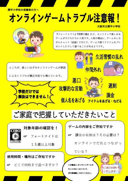 この機会にご家庭でオンラインゲームやインターネットの使い方について、再確認をお願いいたします。