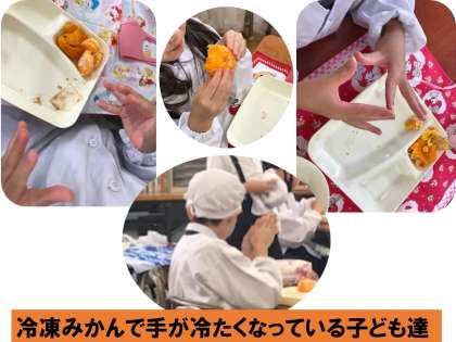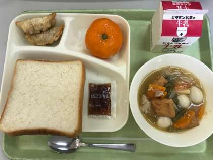 今日の給食は、あげぎょうざ、中華煮、冷凍みかん、食パン、いちごジャム、牛乳です。中華煮は、うずら卵の個別対応献立でした。冷凍みかんは、7月に続き、今年度2回目の登場です。前回も、もう少し暑い日に冷凍みかんが出ていればと思うような天気でしたが、今日も少し曇っていて、冷凍みかんを食べるには涼しかったようです。冷凍みかんを持つ手を温めるためにこすりあわせたりしながら食べていました。