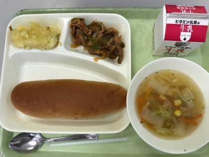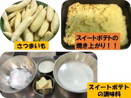 今日の給食は、豚肉と野菜のケチャップソテー、スープ、スイートポテト、黒糖パン、牛乳です。スイートポテトは、秋が旬のさつまいもを使った手作りデザートで、スチームコンベクションオーブンで焼いています。給食のスイートポテトは、甘さが控えめで食べやすいです。どの学年の子ども達にもとても好評でした。給食での作り方を紹介しますので、ご家庭でも子ども達と一緒に秋の味覚を使った料理を楽しんでみてください。