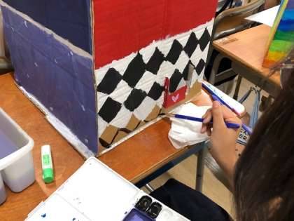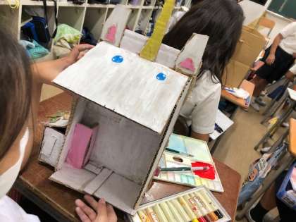 4年図工では、ダンボールを材料にし、ダンボールの特性を活かしてた「おもしろアイデアボックス」づくりをしました。