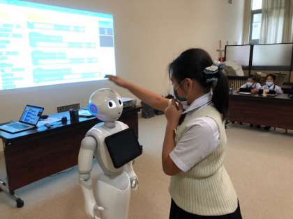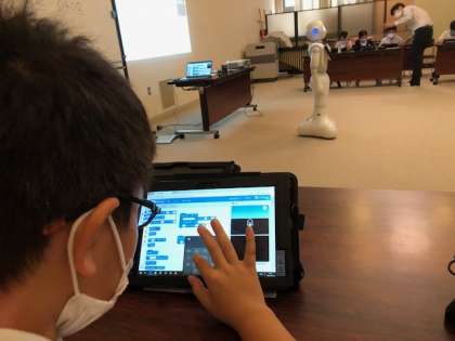 4年生総合の学習では、Pepperのタッチセンサーの機能を使って、クイズづくりに挑戦しました。1年生から学んできたプログラミング学習の学びを活かして、一人一人オリジナルの問題をつくっていくことができました。