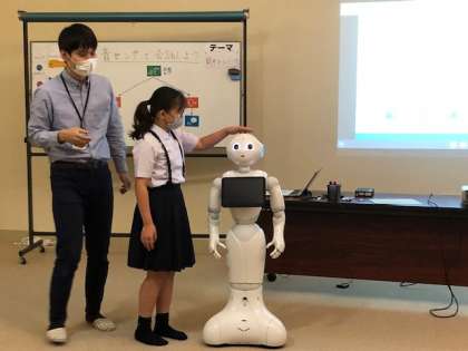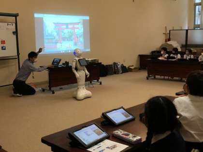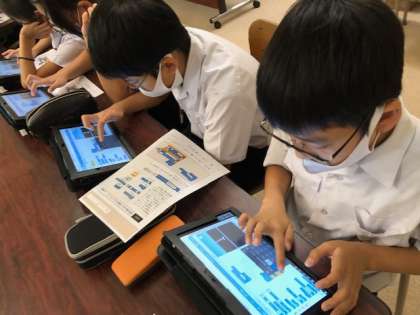 今日の4年総合では、Pepperの音センサー機能をつかって、これまでの総合での学びを説明するプログラミングに取り組みました。教えてほしい場所をPepperに話かけると、「開平小学校には、たくさんのスタンドグラスが受け継がれています」「北浜にある適塾では、たくさんの人が学んでました」など、言葉を聞き分けるプログラムをつくることができました。