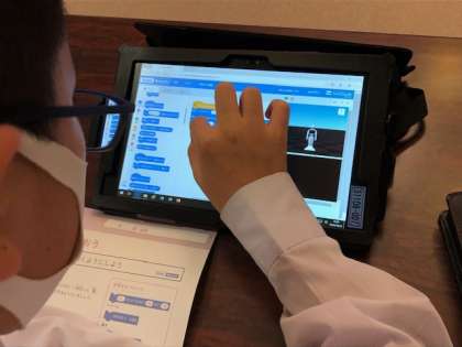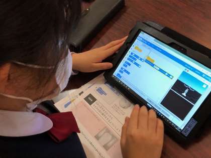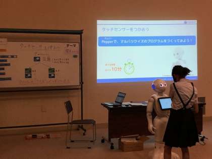 今日は、6年生がPepperのタッチセンサー機能と話す・動く機能をプログラムし、開平小学校〇×クイズをつくりました。「開平小学校の児童数は、毎年、増加していっています。では、今、開平小学校の児童数は、何人でしょう。◯◯◯人と思った人は右手を、◯◯◯人と思った人は左手をタッチしてください。」「昨日の開平小学校の給食は何だったでしょう。」など、日々の学校生活を題材に問題づくりに取り組むことができました。