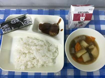今日の給食は、みそカツ、じゃがいもと野菜の煮もの、焼きのり、ごはん、牛乳です。みそカツは、愛知県の郷土料理です。八丁みそや砂糖、みりんなどでたれを作り、油で揚げたカツにかけています。どの学年の子ども達にもとても好評でした。もっと食べたいという声がきかれました。