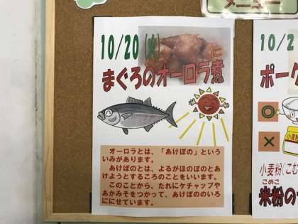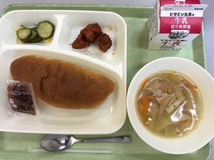 今日の給食は、まぐろのオーロラ煮、ベーコンとじゃがいものスープ、きゅうりとコーンのゆずドレッシング、コッペパン、いちごジャム、牛乳です。まぐろのオーロラ煮はとても人気があり、「もっと食べたかったです。」という声があがっていました。