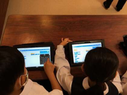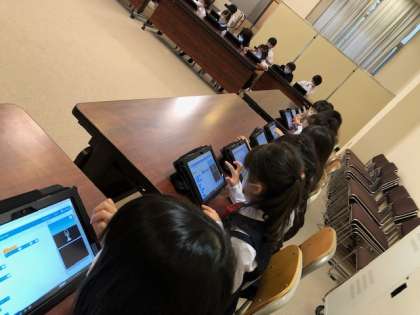 1年生プログラミング学習では、動きとしゃべるブロックを組み合わせ、場面に合わせた動きや言葉をプログラムしていきました。「2つのブロックを並べると順番にしてくれるね」「しゃべると動きが組み合わさったブロックをみつけたよ!このブロックを使うと同時にしてくれた!」とたくさんの発見がありました。子どもたち同士で、どんどん新たな学びが生まれ広がっていました。