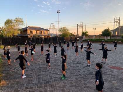 おはようございます。朝の集い、だんだん目が覚めてきました。快晴です。2日目も協力して頑張ります。