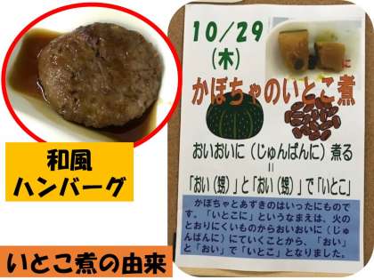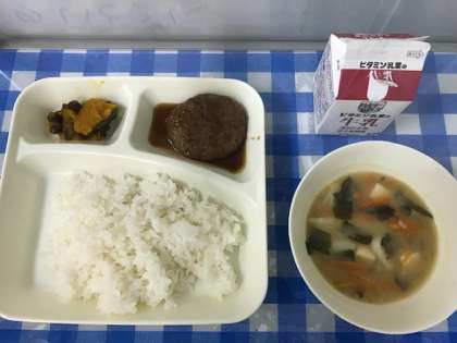 今日の給食は、和風ハンバーグ、みそ汁、かぼちゃのいとこ煮、ごはん、牛乳です。いとこ煮は、火の通りにくい材料からおいおいに(順番に)煮ていくことから「おい(甥)」と「おい(甥)」でいとこ煮という名前がつきました。子ども達にとってはあまり食べなれていない味のようで、苦手な人が多かったです。和風ハンバーグでは、「今日の和風ハンバーグ、てりやきハンバーグみたいでおいしかった。でも、僕の家のてりやきハンバーグもとてもおいしいよ。」とほのぼのとした会話を聞くことができました。