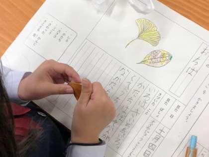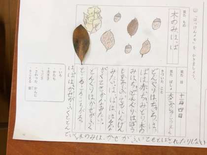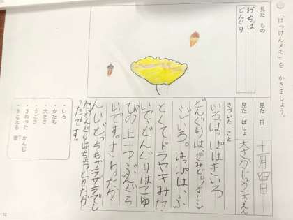 1年国語では、遠足でみつけた秋の様子を「はっけんメモ」にまとめました。手触りやかたちを確かめながら、わかりやすくまとめることができました。
