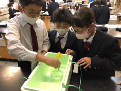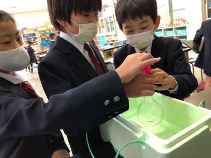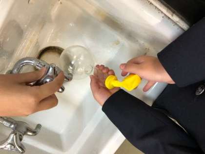 今日の4年理科では、学習のまとめとして、ものの温度による体積の変化をフラスコと風船をつかっての実験で確かめました。「水で冷やしたら、一気にしぼんだ!」「お湯であたためると、こんなに膨らむんだな」と体積の変化をしっかりと感じることができたようです。