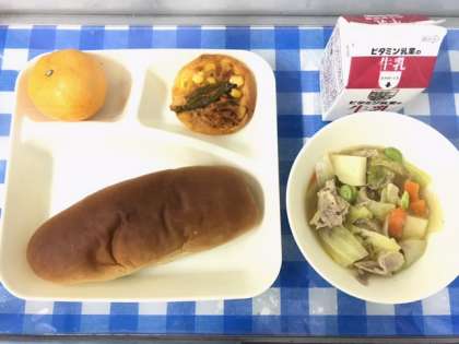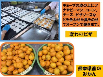今日の給食は、豚肉と野菜のスープ煮、変わりピザ、みかん、黒糖パン、牛乳です。変わりピザは、ギョーザの皮の上に、ツナやピーマン、コーン、チーズ、ピザソースなどを混ぜ合わせた具をのせ、オーブンで焼いています。みかんは、熊本県産のみかんです。変わりピザは子ども達に大人気で、給食時間の途中にクラスを見に行くと、変わりピザを最初に食べてしまった人が多く、お皿に残っている人はほとんどいませんでした。