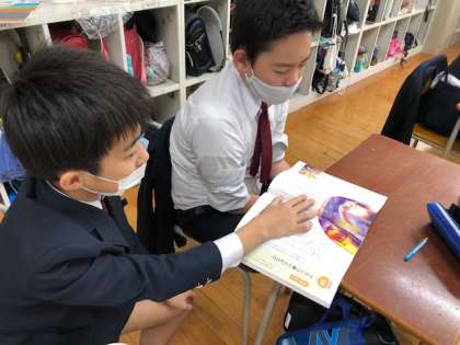 6年道徳では、「ブランコ乗りとピエロ」というお話を通して、お互いの気持ちを思いやるってどういうことだろうと考えました。登場人物になりきって2人で会話することで、お互いを理解し合うということの大切さに気づくことができました。