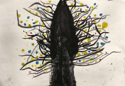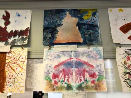 3年図工では、物語を読んで絵にあらわす活動に取り組みました。モチモチの木のお話からイメージを膨らませ、デカルコマニーやスパッタリンという技法を用いて描くことができました。