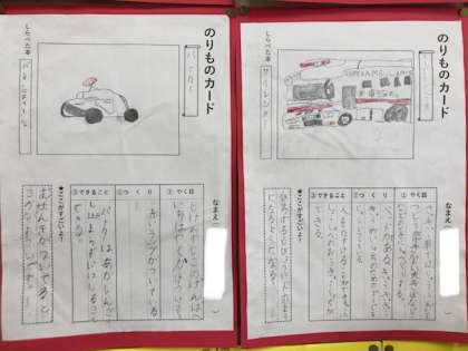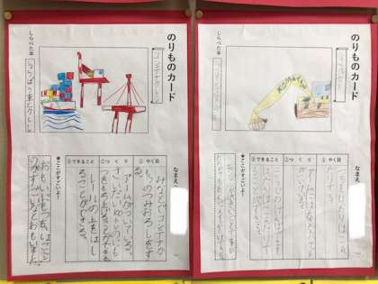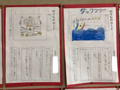 1年国語では、説明文「いろいろなふね」を読んで見つけた、「やく目」や「つくり」「できること」をわかりやすく伝える方法を使って「のりものカード」をつくりました。さまざまな本から必要な情報をみつけ、わかりやすくまとめることができました。