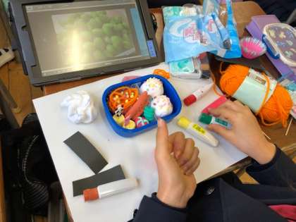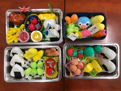 図工では、さまざまな材料を使って作品づくりに取り組みます。3年図工では、紙粘土や毛糸、画用紙、絵の具をつかって、お弁当をつくりました。設計図を活かしたり、本物の様子をタブレットで検索したりしながら、本物そっくりを目指してつくっていきました。『ソースのトロトロな感じを絵の具で表現しました』『粘土の具材と毛糸のパスタを混ぜることで、より本物に近づいたな」「卵焼きは、白味がある部分をリアルにしてみました」など、たくさんの工夫ができました。