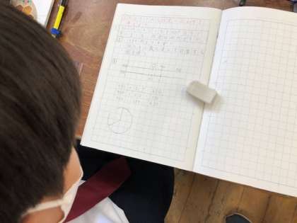 5年算数では、割引された代金の求め方を考えました。見通しをたて、それぞれが考えた求め方を交流することで、いろいろな考え方にも共通点があることに気づくことができました。