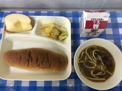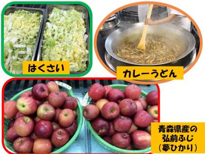 今日の給食は、カレーうどん、はくさいのおひたし、りんご、黒糖パン、牛乳です。カレーうどんは、1年に1回の登場で、久しぶりでした。はくさいのおひたしは、冬野菜のはくさいをたくさん食べることができるメニューです。りんごは、弘前ふじ(夢ひかり)という品種のりんごです。ふじから作られましたが、ふじよりも果肉が柔らかく、ジューシーなのが特徴です。
