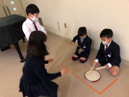 2年音楽では、天神祭のだんじり囃子に味わおうという学習に取り組んでいます。龍踊りをまねることで身体全体で音楽を感じることができました。1年生のときと違って、2年生では楽器(太鼓と鉦)にも挑戦!「もっとリズムにのって踊れるようになりたいな」「太鼓と鉦のリズムをぴったり演奏できるようになりたいな」と次の音楽の時間のめあてを自分たちで見つけることができました。