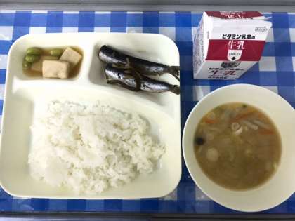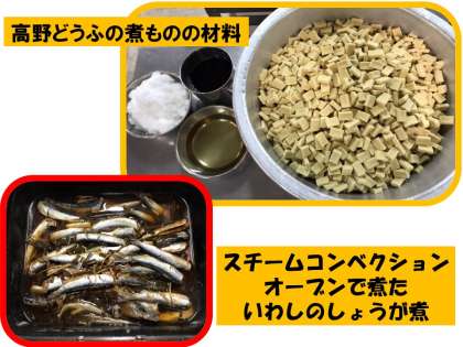 今日の給食は、いわしのしょうが煮、みそ汁、高野どうふの煮もの、ごはん、牛乳です。いわしのしょうが煮は、スチームコンベクションオーブンで煮て、骨までやわらかくなっていました。「やわらかいから骨まで食べられた。」という人と、「骨が多すぎて食べるのに時間がかかりました。」という人と様々な反応でした。高野どうふの煮ものは、だし汁に砂糖やみりん、うすくちしょうゆで味つけした調味液がしっかりとしみて、おいしい煮ものでした。このような和食の献立になると、食べなれていないからか、食べるのに苦戦している人が多くなります。いろいろな献立をおいしく食べられるようになってほしいです。