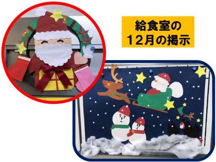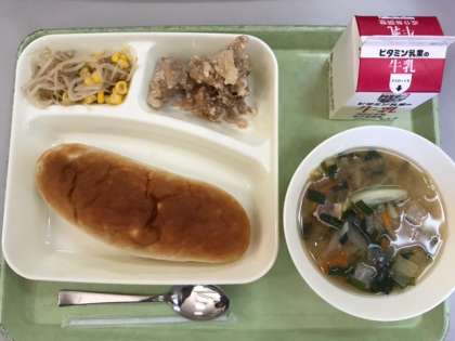 今日の給食は、鶏肉のからあげ、中華みそスープ、もやしとコーンの甘酢あえ、おさつパン、牛乳です。鶏肉のからあげは、いつも子ども達に大人気のメニューです。中華みそスープは、豚骨スープと赤みそを使ったスープです。12月から給食室の掲示が変わりました。給食室の掲示を見て、『今年ももうすぐ終わるんだなぁ。』という月日の経過をとても感じました。