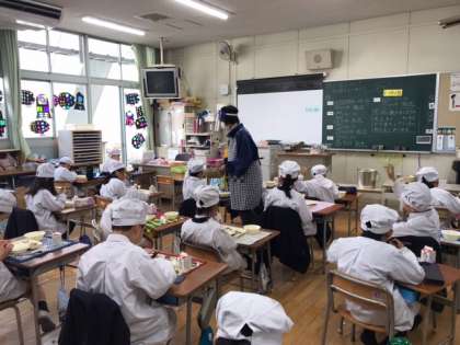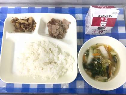 今日の給食は、豚肉のねぎじょうゆ焼き、すまし汁、れんこんのおかかいため、ごはん、牛乳です。今日の給食には、今の季節が一番おいしい、はくさいやれんこんなどの野菜がたくさん使われていました。コロナ禍での給食は、隣の人との距離を考え、前を向いて静かに食べる日々が続いています。おかわりも静かに手をあげ、担任の先生に盛りつけてもらいます。一人一人の気をつけようとする心がけが大切です。