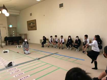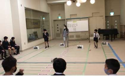 2年音楽では、船場の通りの名前を覚えるために歌い継がれてきた「船場通り名おぼえうた」の学習に取り組んでいます。生活科の学習で行った町探検の経験が、とても活かされています。「道修町に少彦名神社はあったのは覚えてるけど、地図のどこかはわからないなぁ。このあたりだったんだけど……」「通り名おぼえうたをうたうと、楽しいおつかいになりそう」など日々の生活ともつなげていっています。