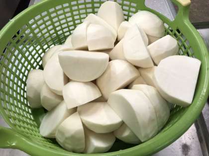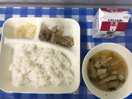 今日の給食は、鶏肉のしょうゆマヨネーズ焼き、五目汁、かぶのゆず風味、ごはん、牛乳です。鶏肉のしょうゆマヨネーズ焼きは、鶏肉に塩やしょうゆ、マヨネーズなどで下味をつけ、オーブンで焼いています。かぶのゆず風味のかぶは、給食では1年に1度だけ登場します。かぶは、寒い時期に甘みが増しておいしいです。今日もどのクラスも「とてもおいしかったです。」と大満足の様子でよく食べていました。