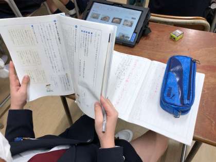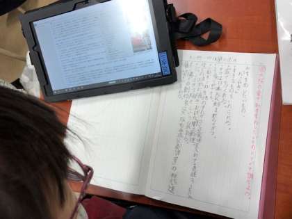 4年国語では、これまでの説明文の学習などで見つけた分かりやすく伝える表現の工夫を使って、「ふるさとの食」を伝えるという書く活動に取り組んでいます。調べたことから、自分の考えとその理由を分かりやすく書くために、さまざまな事例にあげたいことを調べています。家庭学習ノートを活用し、より調べ学習を深めている姿もみられました。
