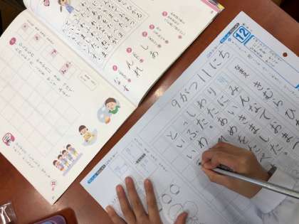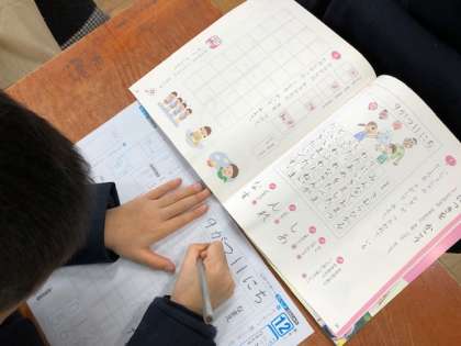 1年書写の学習では、字の形やバランスに気をつけて、丁寧に文字を書く学習に取り組んでいます。今日のお手本は、日記です。是非、日々の日記やはがき新聞を書くときに生かしていってほしいとおもいます。
