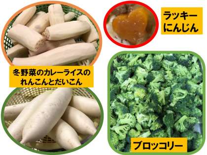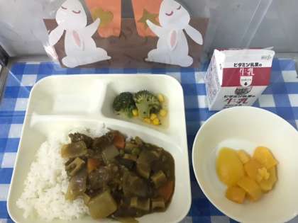 今日の給食は、冬野菜のカレーライス、ブロッコリーとコーンのサラダ、黄桃(缶)、牛乳です。冬野菜のカレーライスには、だいこんやれんこんなどの今が旬の野菜が入っていました。だいこんから甘味が出て、まろやかなカレーライスになっていました。今日は、ラッキー人参も入っていました。「〇〇さんにラッキー人参が入っていた。」「〇〇さんにも入っていたよ。」と子ども達がたくさん知らせてくれました。冬野菜のブロッコリーを使ったサラダも出たので、今日はたくさんの冬野菜を食べることができました。旬の野菜をたくさん食べて、免疫力を高め、かぜや病気の予防をしてほしいと思います。
