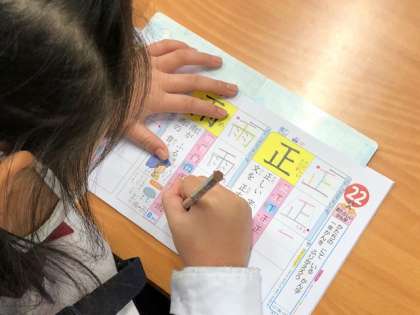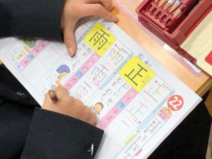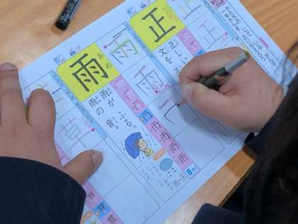 1年国語では、身の回りにあるさまざまな漢字を学習しています。今日は「雨」。漢字の成り立ちを知り、形やバランスに気をつけて、丁寧に練習することができました。