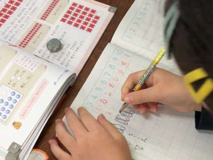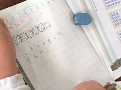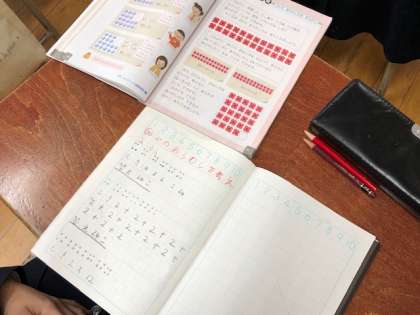 2年算数では、これまでに学習したさまざまな計算を使って、大きな数を表す方法を考えました。「4つのまとまりで考えると……」「何回もたし算するってことは……」とかけ算の意味を理解し、活用することで、よりわかりやすい表し方を考えていくことができました。