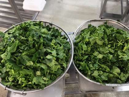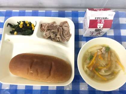 今日の給食は、豚肉のガーリック焼き、スープ、ほうれんそうのソテー、黒糖パン、牛乳です。ガーリック焼きは、にんにくの風味がよくきいていました。スープは、ローレルのさわやかな香りがしました。ソテーは、今が旬のほうれんそうとコーンを使った炒めものです。給食は、いつも栄養価の高い旬の食材をたくさん使って作られています。