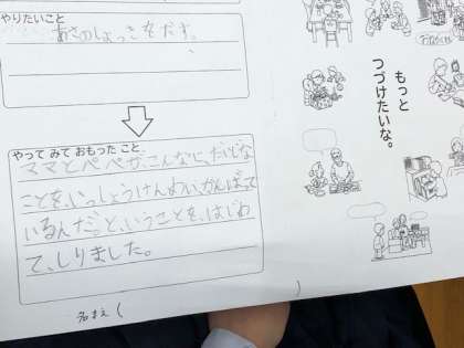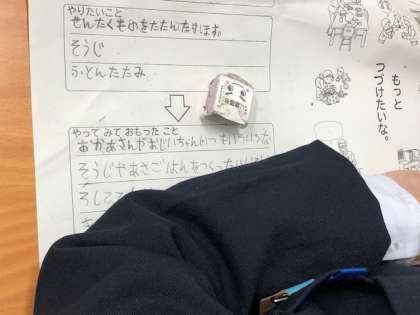 1年生活科では、さまざまなおうちのお仕事にチャレンジしました。今日は、クラスで、それぞれが取り組んだことをふりかえり、気づいたことを交流しました。「おうちの人はこんなにいろいろなことをしていたんだな」「これからも、続けてできるようにしたいな」と家族の一員として自分にできることを考えることができました。