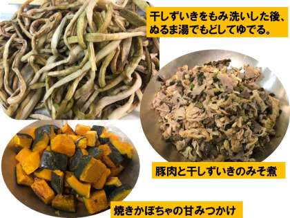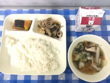 今日の給食は、豚肉と干しずいきのみそ煮、すまし汁、焼きかぼちゃの甘みつかけ、ごはん、牛乳です。干しずいきは、さといもの葉柄(葉と茎をつなげている柄の部分)を干したもので、食物繊維やカルシウムが豊富です。豚肉やうすあげと一緒にみそ煮にすることで、味がよくしみておいしいです。焼きかぼちゃは、今日が冬至(1年で1番昼が短い日)に食べる習わしから登場しています。寒さが厳しい冬を乗り切るために、かぜをひきにくいと言われているかぼちゃを食べる習慣があります。